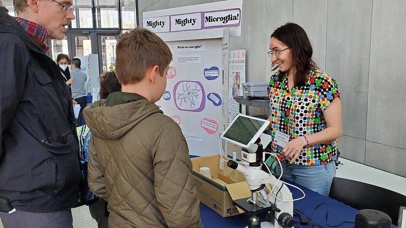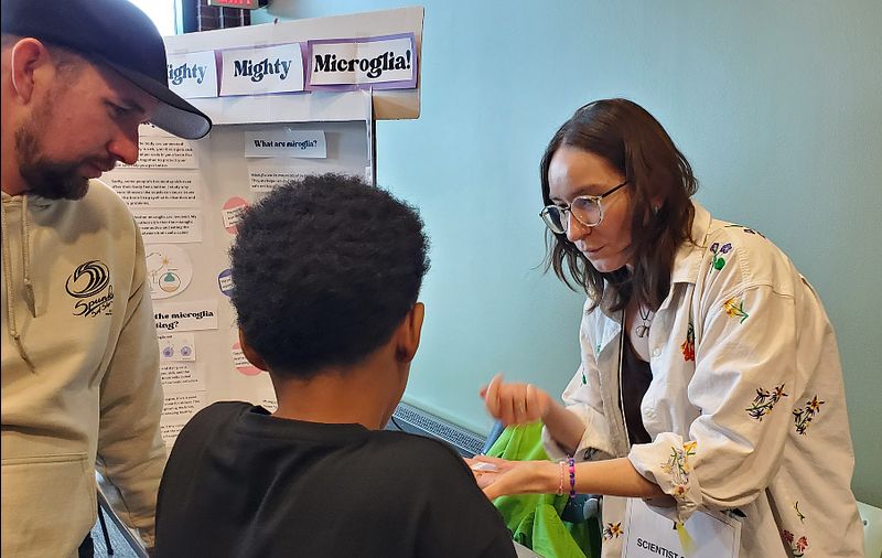 Guiding a student through Mighty, Mighty, Microglia! an interactive activity developed in the Science Communication Fellows Program at a Scientist Spotlight Event.